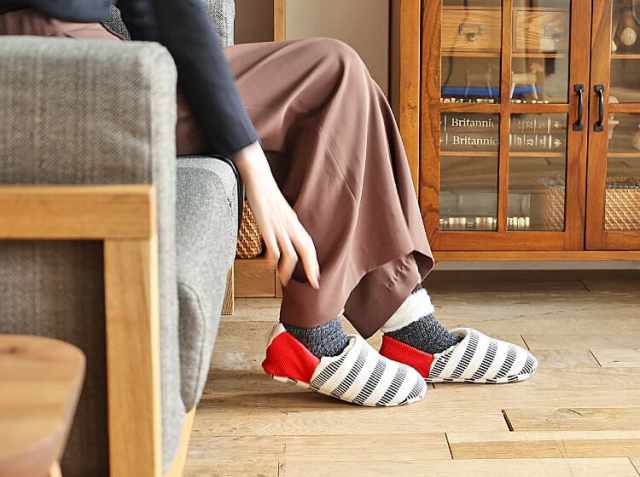 「merippa(メリッパ)」には、老舗カットソーメーカーの技術により誕生した、伸縮性に優れた‟メリヤス素材”を主に使用し、かかと部分にはフィット感のあるリブニットを採用しています。1度足を入れたら思わずホッとするような、包み込まれる心地よさや、温もりを感じられるようにと、職人がひとつひとつ心を込めて作り上げています。