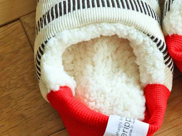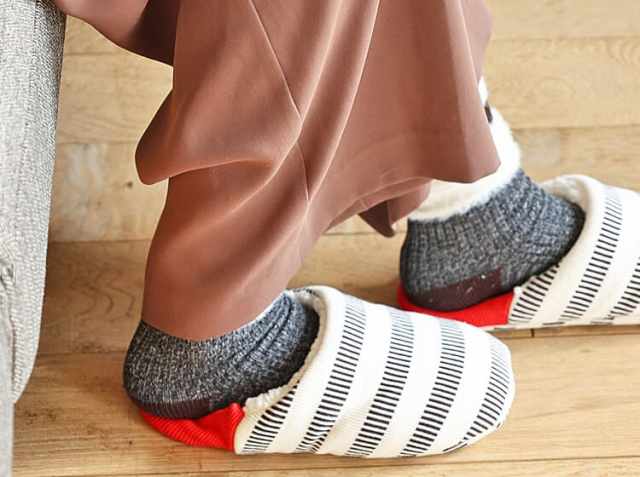 かかと部分には伸縮性のあるリブニットを使用しており、この部分を立ててかかとを包めば靴下みたいに脱げにくく、踏むとスリッパ風にもなりますよ