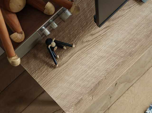 天板には、強度が高く、耐水性にも優れ、より木目を再現するために強化紙化粧板を使用しています。