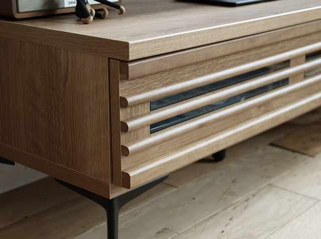 シャビーナチュラルな雰囲気と天然木ラバーウッド無垢材の格子(ルーバー)がスタイリッシュさを感じさせてくれる幅100cmのテレビボード、Jami(ジャミ)。フラップ扉収納には、AV機器などやリビング周辺の雑多になりがちなものをすっきり収納してくれます。シンプルに仕上げながらも、立体的な表情を作る格子(ルーバー)を前面に施し、陰影をつくる事でデザイン性のある仕上がりに。そして職人の方が1点1点丁寧に作り上げた日本製。