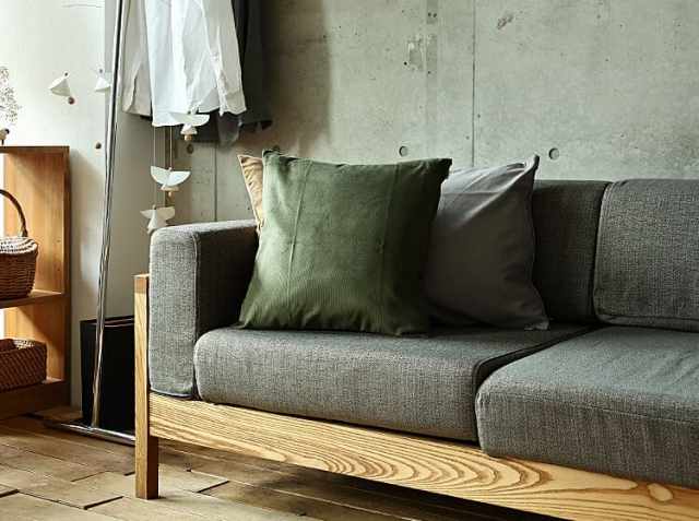衣類に使われる14ウェールの綿100%のコーデュロイ生地を使用した日本製クッションカバー、LIB(リブ)。カラーは、グレー・マスタード・ベージュ・カーキ・チャコールグレーの5色からお選びいただけます。サイズは45cm×45cm。