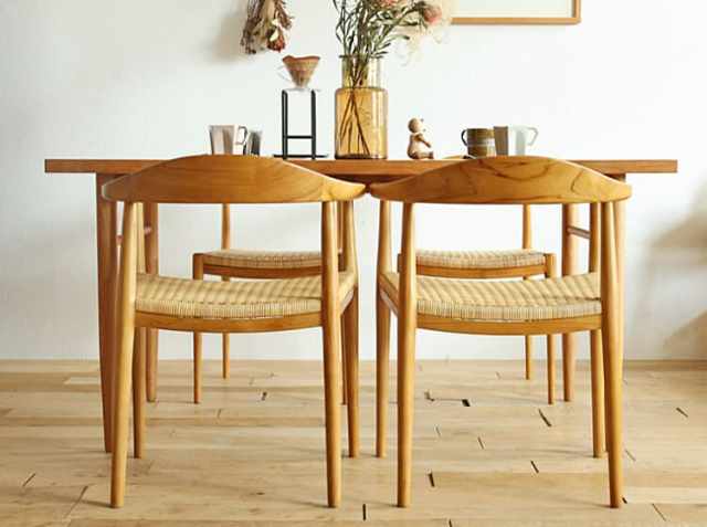 フレームに使われているチーク材は、木目が緻密で美しく、乾燥による狂いが少なく、耐久性に優れた家具に最適な稀少な銘木。本格アームチェアでありながら並んでも圧迫感のないサイズ。軽くて扱いやすく、テーブルの下に納まるフレキシビリティー※テーブルのサイズにより異なります。まるでパーソナルチェアのようなゆったりとした座り心地が、ダイニングとリビングが融合したリラックス空間を演出してくれます。