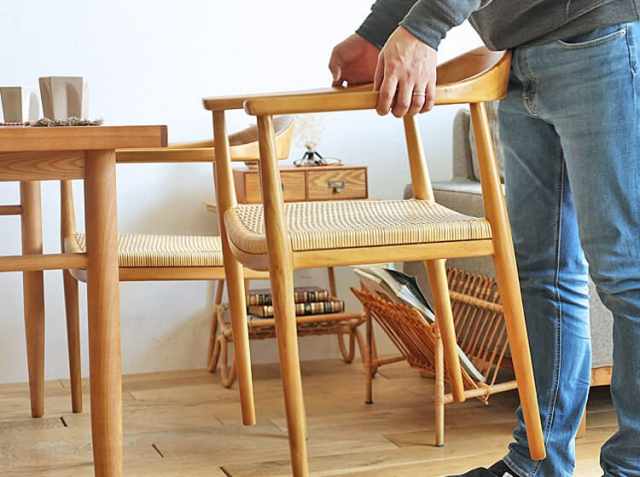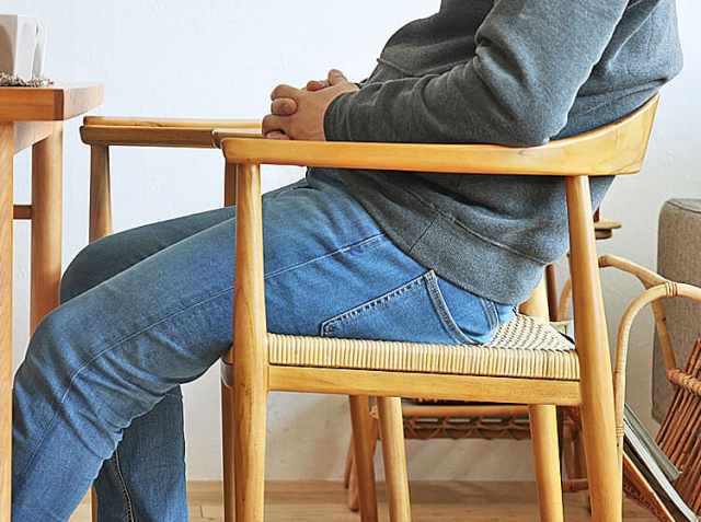 横から見た時の佇まいもおしゃれな肘掛け部分は、出入りしやすく、立ち座りしやすいアームタイプ。ダイニングテーブルへの収まりが良いので、限られた食卓の空間にもおすすめ♪広めの背もたれは座ったときに包み込まれるようなホールド感がありますよ♪またラタンの張りのある弾力は、しっかりとした座り心地となっていますので、家族やお友達と過ごすダイニングでの時間が長くなりそうですね♪