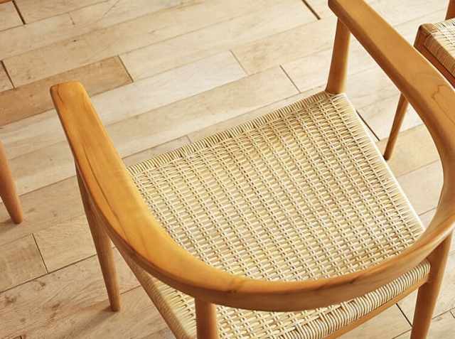 座面に使用しているラタン(籐)は、日本に自生しておらず、インドネシア・マレーシアなどの東南アジアや、アフリカ・オーストラリアなどのジャングルに自生するヤシ科のツル性植物です。その繊維は植物中最長にして最強といわれ、数十年の耐久性があります。また木材に比べて非常に軽いため扱いやすい点も、ラタンの魅力のひとつです。天然素材ですので、使うほどに表面が深みのあるアメ色に変化して、独特の美しさを醸し出すのも特徴。