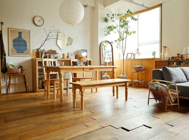 素材に使われているのは節ありのパイン無垢材。マツ科に属するパイン材の特徴は、色が明るく、節が多いということです。そのため、ナチュラルな雰囲気を演出することができるので、フローリングに使われることも多い素材となっています。