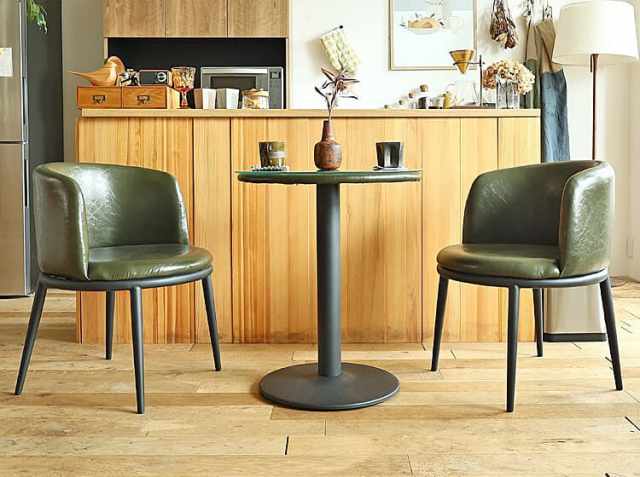 直径60cmの円形テーブルと体を包みこむようなフォールド感が特徴のデザインはまるでラウンジチェアのような贅沢な座り心地を実現し、エイジング加工が施されたバイキャストレザーとスタイリッシュなアイアンの脚の組み合わせがヴィンテージ感を醸し出すダイニングチェアー2脚セットのカフェダイニング3点セット、Midde(ミッド)。