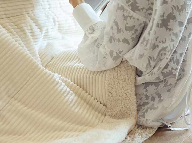 フチにはふわふわのボアで暖かく、肌に触れる裏地には起毛処理が施された生地を採用していますので、とても柔らかく優しい肌触りの仕上がりになっています。薄掛け布団はかさばることがなく、体にフィットして熱を逃しませんので、快適にお過ごしいただけるのも特徴。