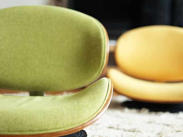 背もたれ部分の木目部分は緩やかにカーブを描き、ブラウンとファブリックの調和がとれたデザインとなっています。