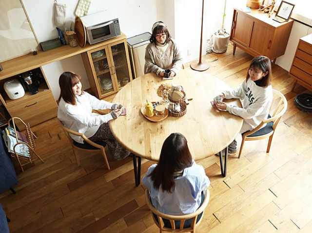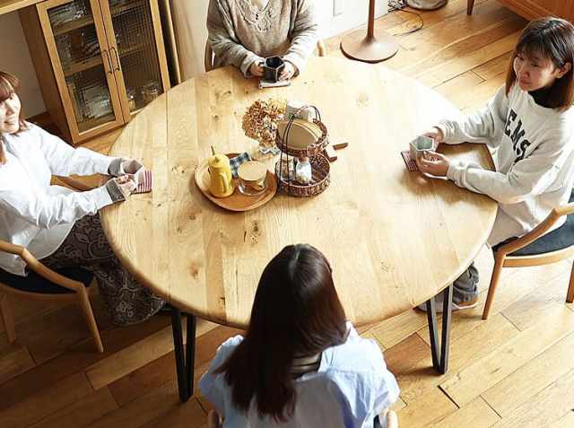 丸テーブルは座っている人がテーブルの中心を向いて座っているので、全員の顔が見えて、会話も弾み、明るく楽しい食卓の場を作ってくれるのも特徴。