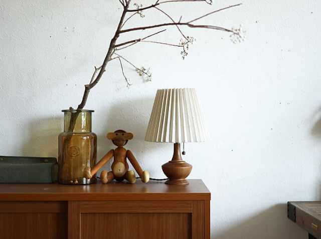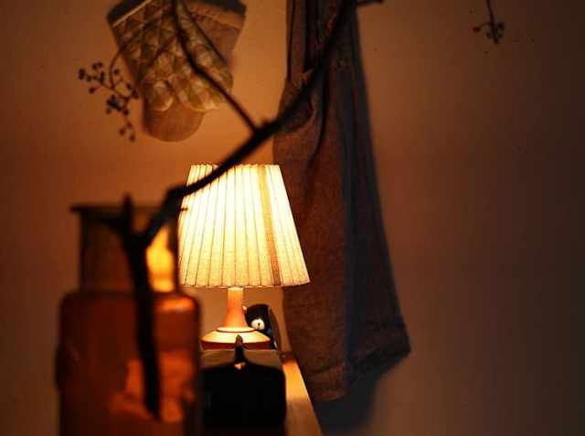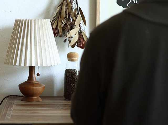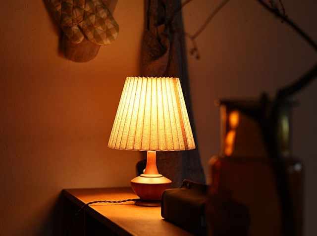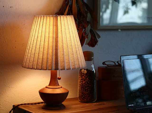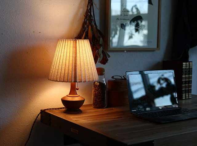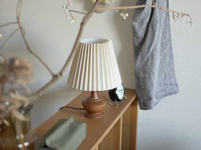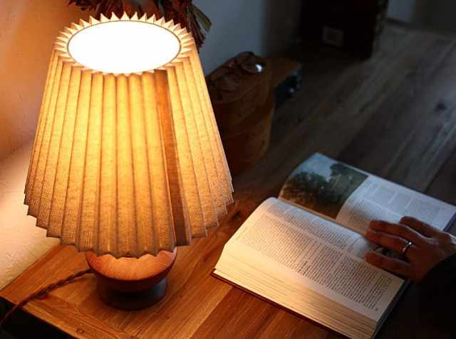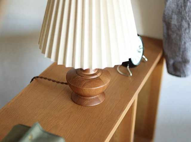 アンティークテイストのなめらかな印象のウッドベースに、やさしい光を灯すブリーツ状のファブリックシェードを合わせたテーブルランプ、Peruna(ペルナ)。明かりをつけると、天然木を使用したベースの稜線が夕陽に照らされた丘のシルエットように見えるのが特徴♪少し大きめのファブリックシェードとの絶妙なアンバランスさがシンプルなデザインの中にアクセントとなっていて、とてもかわいいですよ。