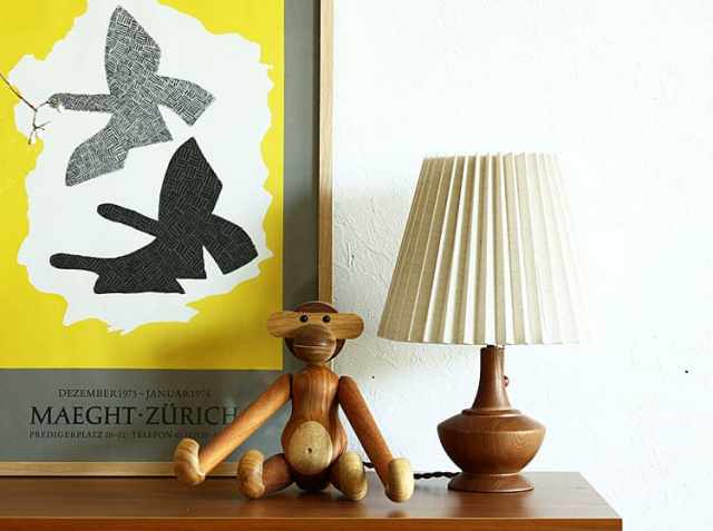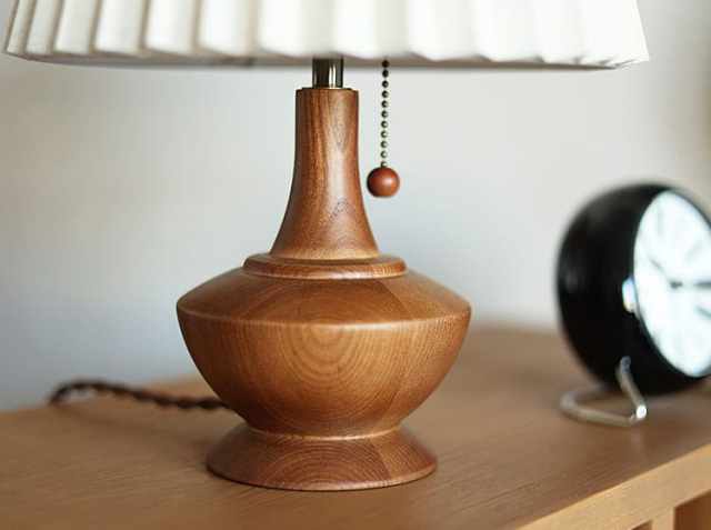 アンティークテイストの曲線を描いたフォルムが特徴の天然木無垢を使用したウッドベース。灯りをつけていないときはオブジェのようで、灯りをつけたときはファブリックシェードからこぼれる光で陰影がついて趣のある雰囲気に。