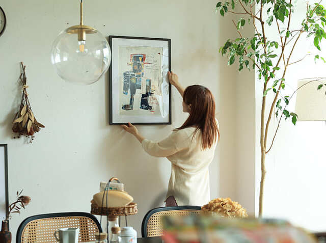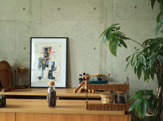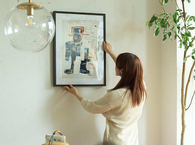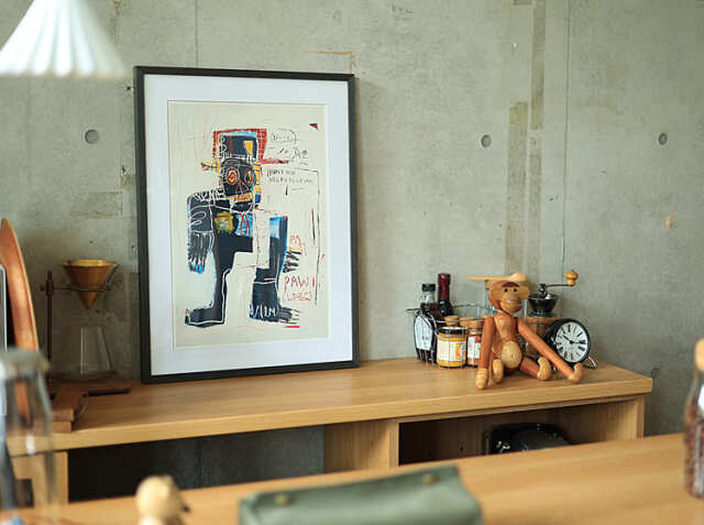 リビングや寝室、ダイニングなどの壁(ウォール)スペースはお部屋の中でも面積が多く、何も飾らなければ意外と無機質ぽくなってしまいます。ストリートのグラフィティ・アート的な表現のバスキアのアートポスターと天然木を使用したダークグレーのフレームとの組み合わせはお部屋を一気にバスキアの世界に仕立ててくれますよ。