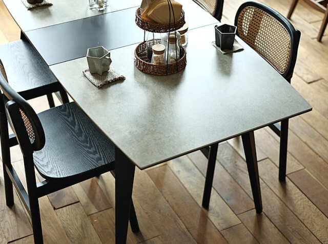 モダンさや上品さを感じるセラミック天板を使用した幅140cmから170cmに伸長するダイニングテーブル、Gano(ガノ)。天板全体に弧を描いた角が取れた柔らかなデザインに加え、伸長した際のグレー×ブラックの2トーンカラーがカジュアルさも演出してくれますよ。