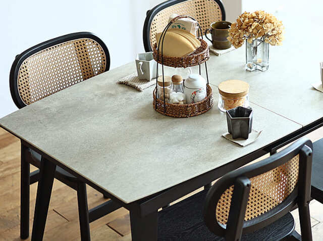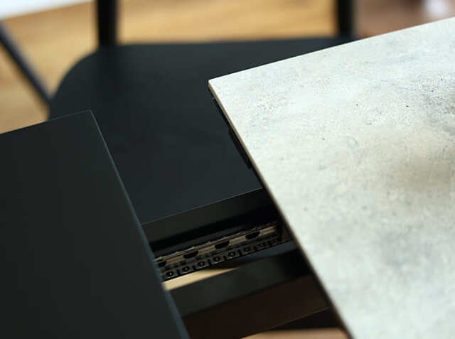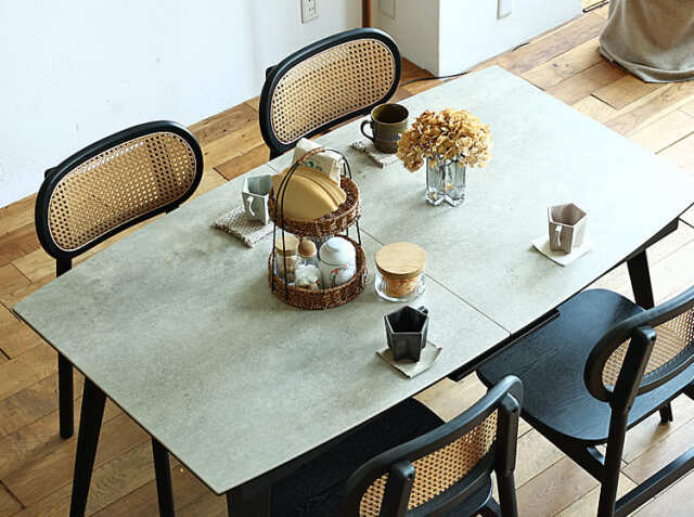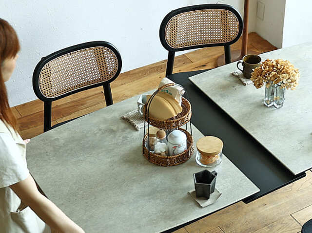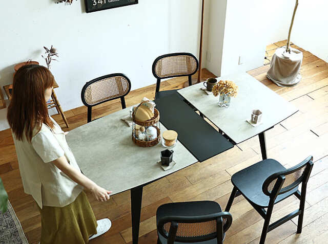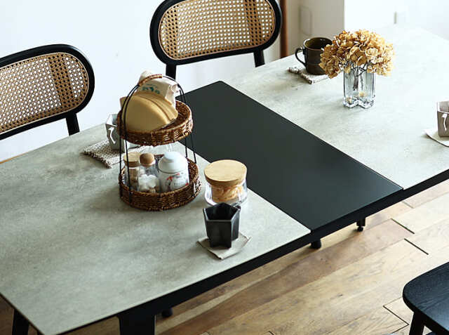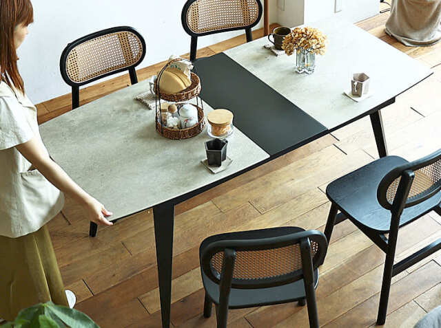 延長されたブラックカラーの天板とセラミックの石目調とコントラストが綺麗なテーブル。全体的に弧を描いた柔らかな雰囲気のセラミック素材の伸長式のダイニングテーブルで食卓を彩りませんか。