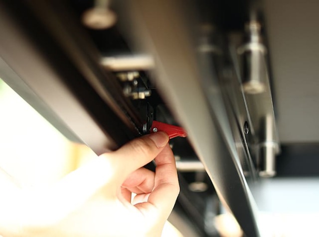 天板下のロックを解除して、天板を伸ばすことができます。主天板の下に格納されているブラック天板が出てくるという構造です。主天板を引くだけで簡単に伸縮できまよ。