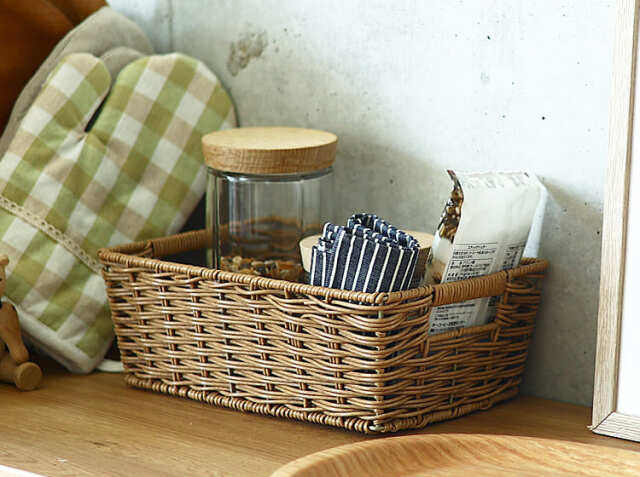 水洗い可能な天然素材風のフェイクラタンを使用した、暮らしに馴染むバスケット 角型抜き手バスケット Towc(トーク) Mサイズ。