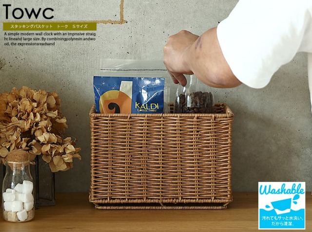 水洗い可能な天然素材風のフェイク素材を使用した、暮らしに馴染むバスケット スタッキングバスケット Towc(トーク) Sサイズ。