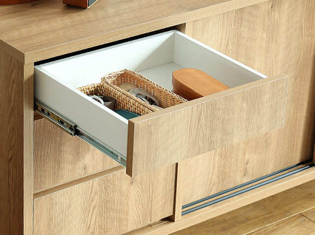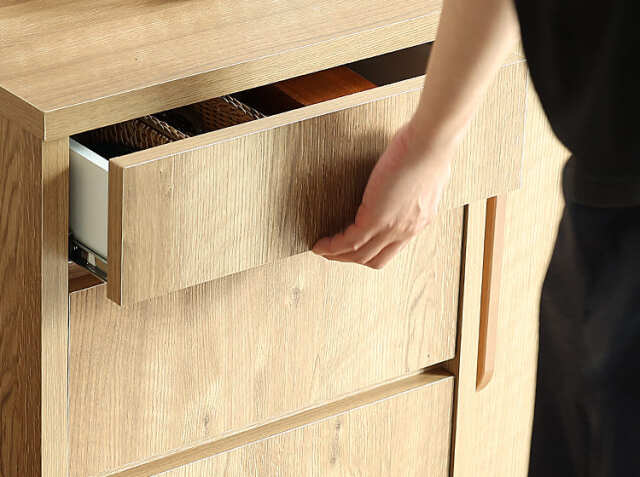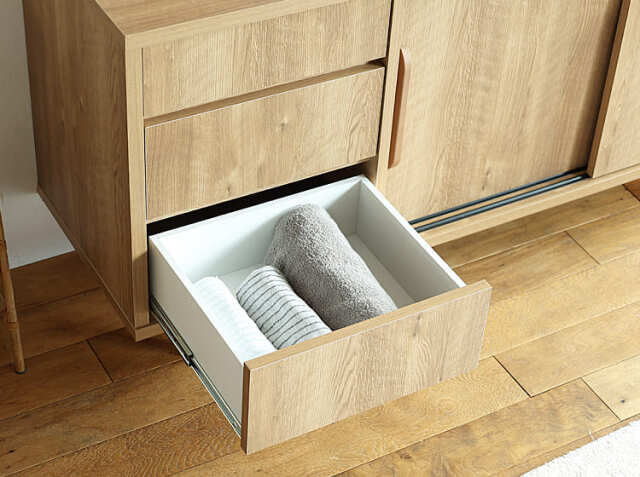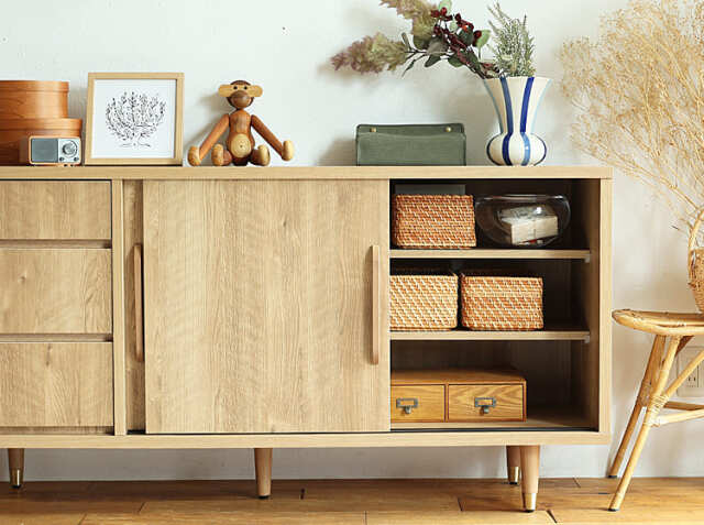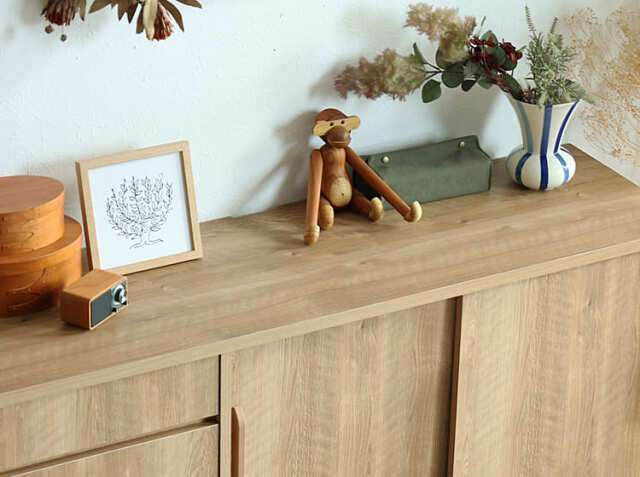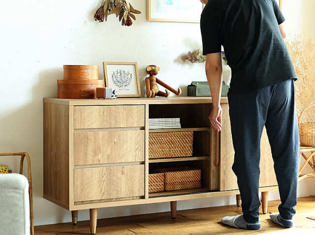 3杯の引出し収納と引き戸収納で、リビングや寝室の小物などをたくさん収納することができますので、お部屋をすっきり見せてくれます。ダイニングで使用する際は、天板部分に毎日使うコーヒーウェアなどを置き、キッチン収納のような使い方もおすすめ♪北欧やナチュラルコーデのお部屋に馴染むテイストで、お部屋の印象を明るく変えてくれるアイテムですよ。
