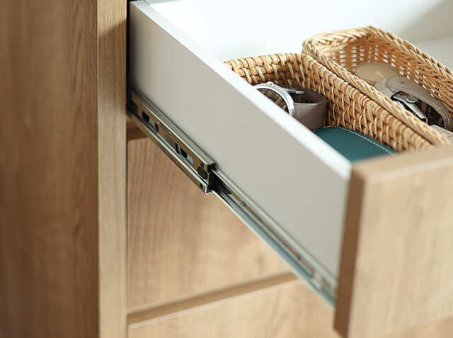 引出し収納は、奥のものまで取り出しやすいフルスライドレールを採用しています。