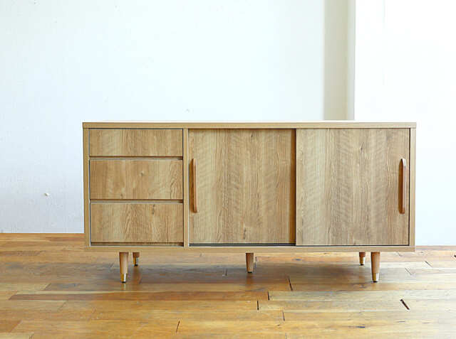 天然木の木目を再現したプリント化粧板の温かみのある雰囲気とワンポイントに脚部にゴールドカラーのスチール部材を組み合わせたシンプルな北欧デザインが特徴の幅150cmのサイドボード、Kalen(カレン)。