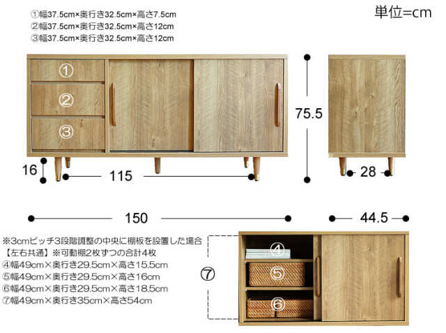 本体:幅 150cm × 奥行き 44.5cm × 高さ 75.5cm 【引出し収納】 上段:幅 37.5cm × 奥行き 32.5cm × 高さ 7.5cm 中段:幅 37.5cm × 奥行き 32.5cm × 高さ 12cm 下段:幅 37.5cm × 奥行き 32.5cm × 高さ 12cm 【引き戸扉収納】 ※3cmピッチ3段階調整の中央に棚板を設置した場合 【左右共通】※可動棚2枚ずつの合計4枚 上段:幅 49cm × 奥行き 29.5cm × 高さ 15.5cm 中段:幅 49cm × 奥行き 29.5cm × 高さ 16cm 下段:幅 49cm × 奥行き 29.5cm × 高さ 18.5cm 全体:幅 49cm × 奥行き 35cm × 高さ 54cm 配線穴付き。 【脚部】 高さ16cm |