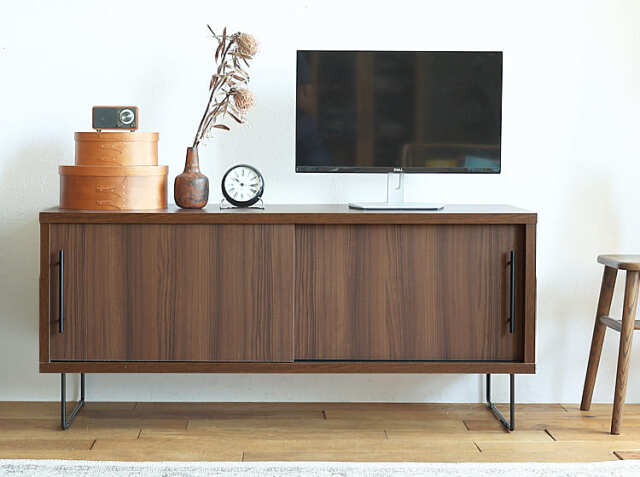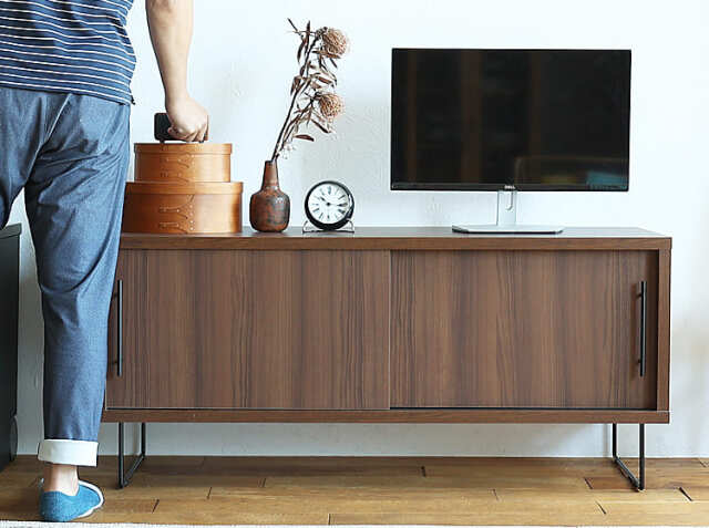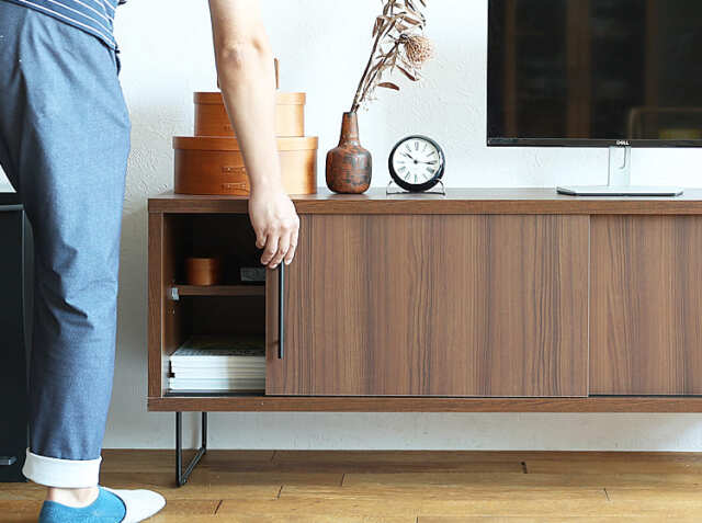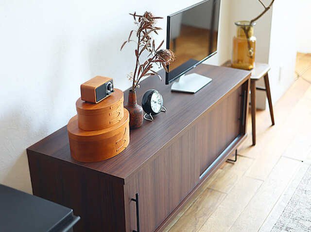 ナチュラルな木目を再現したプリント化粧板を使用したスライド式の扉。収納しているものを隠してくれますので、すっきり片付いたお部屋の印象にしてくれますよ♪天板には、お気に入りの雑貨やオブジェなどを飾ると、テレビを置くだけの家具という役割に加えて、お気に入りの空間を創ってくれるキャビネットの役割も担ってくれます。