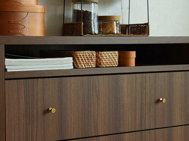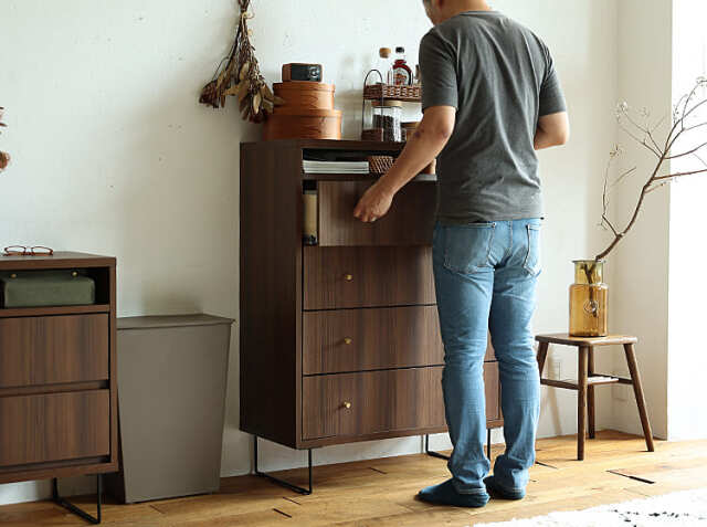 家にいる時間の大半を過ごすリビング。だからこそ、便利に使えておシャレに見えるチェストは必須アイテムです。ちょっとだけでも空いた場所に置いて、お部屋の中に収納と優雅さをプラスしてみませんか?女性の方でもストレスなくご使用いただける高さは112cm。奥行きも圧迫感を感じさせない40cm。すっきりとシンプルなデザインは、置く場所を選ばず、お家の幅広いシーンで活躍してくれますよ。