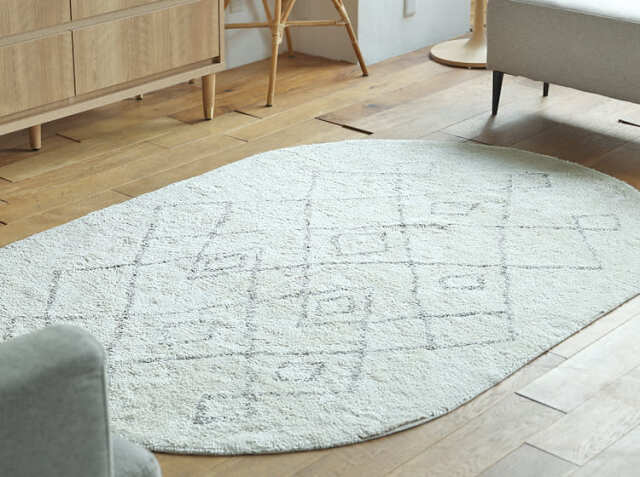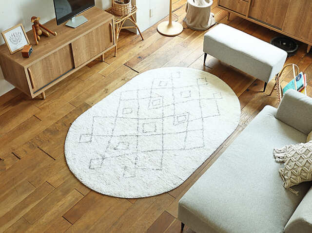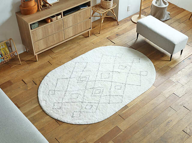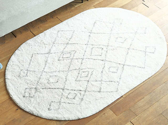 モロッコの伝統的なモロッカンパターンをコットンタフトで表現したモダンでカジュアルなデザインのラグマット、ERIVAN RUGオーバルタイプ。サイズは130cm×200cmとなっています。