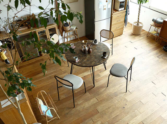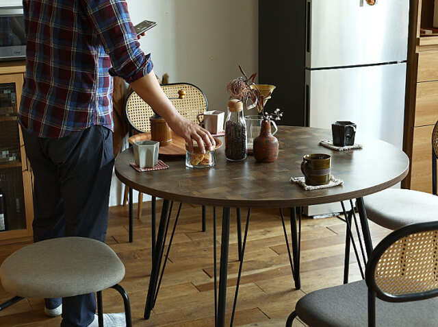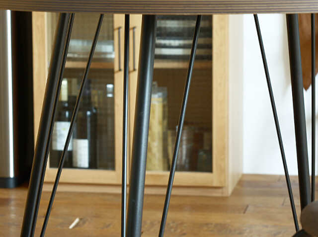 こちらのテーブルは4本脚タイプ。脚間にチェアを4脚置くことはもちろんですが、360°どの位置にも座ることができるのが特徴の円形タイプは、使用人数が限定されにくいのもメリット。スツールなどを置くと5人から6人くらいまでは違和感なく使用できます。