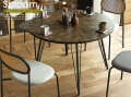 木目調のメラミン化粧繊維版を使った個性的なデザインの直径105cmの円形ダイニングテーブル。3人から4人でのご使用にちょうどいいサイズとなっていますが、間にスツールを置くことができますので最大で5人から6人くらいまで食卓を囲むことができますよ。