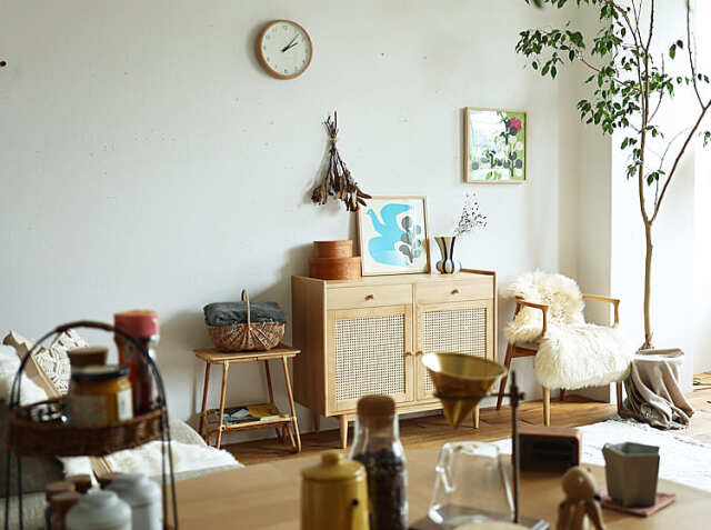 壁掛け以外にも、キャビネットなどの収納棚の上に置くだけでも空間をおしゃれに演出してくれますよ。