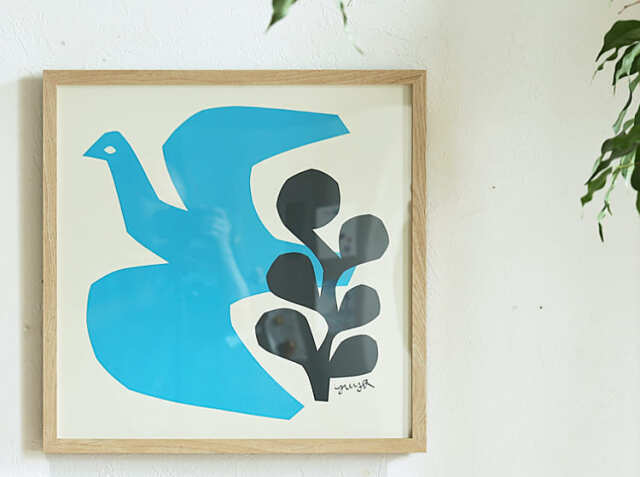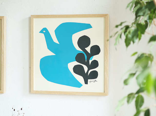 暮らしにやさしく馴染んでいくようなアトリエ・フォーク 切り絵作家 YUYA デザインのアートポスター、BLUE BIRD。幅42.5cm×奥行き42.5cmサイズ。1枚だけで飾っても複数枚並べて飾っても、お気に入りの一枚をお部屋にプラスして、身近にアートを感じてみませんか?