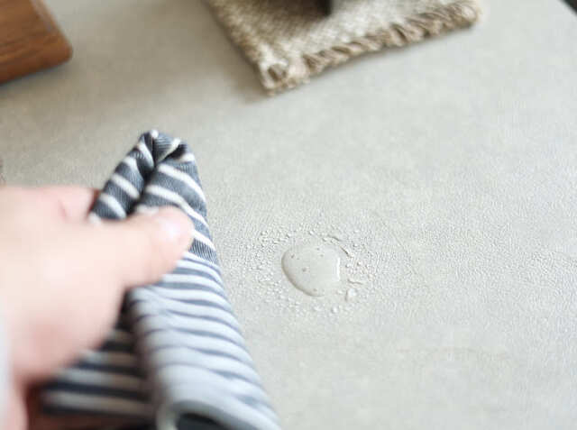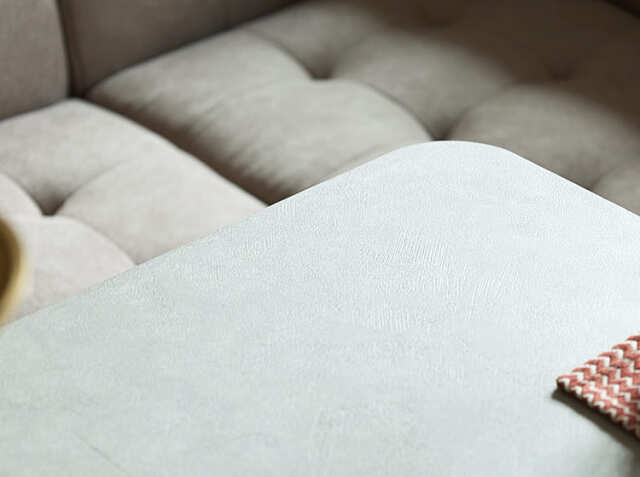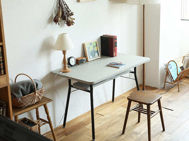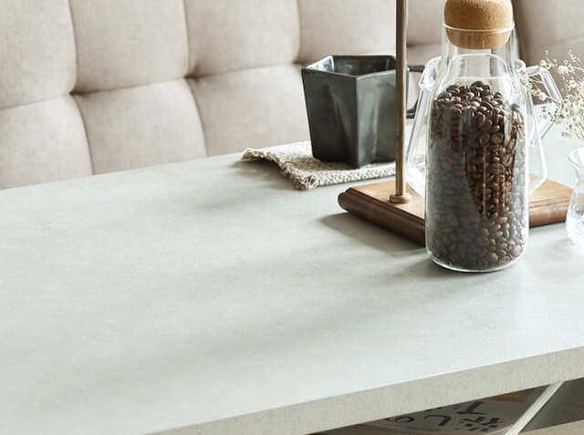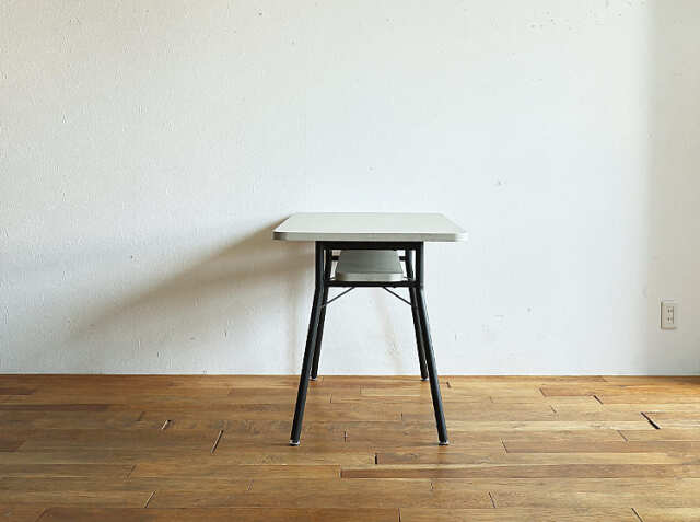 写真では少しわかりにくいのですが天板の表面を指で撫でると少しだけですが凸凹とした感触があります。それだけホンモノを思わせる工夫がされている証拠なんです。また天板に使われているのはメラミン化粧板。傷や汚れに強い素材で、カフェなどのテーブルによく使われている素材となっています。