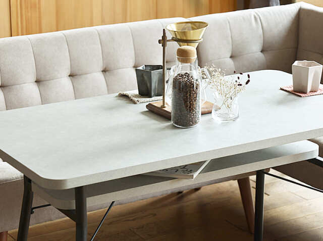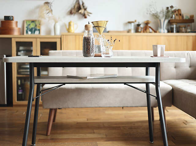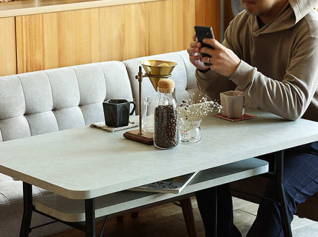 ソファーに合わせて使うように標準的なダイニングテーブルより少し低めの高さ68cmに設計されています。マットな質感のスタイリッシュな脚部はシャープな印象に。天板や棚板には石目調のメラミン化粧板を使用しています。表情豊かな雰囲気となっていますので、お部屋の雰囲気を明るくしてくれますよ♪天板下の収納棚にはリモコンや読みかけの雑誌や新聞などをサッと置くことができますのでとても便利です。