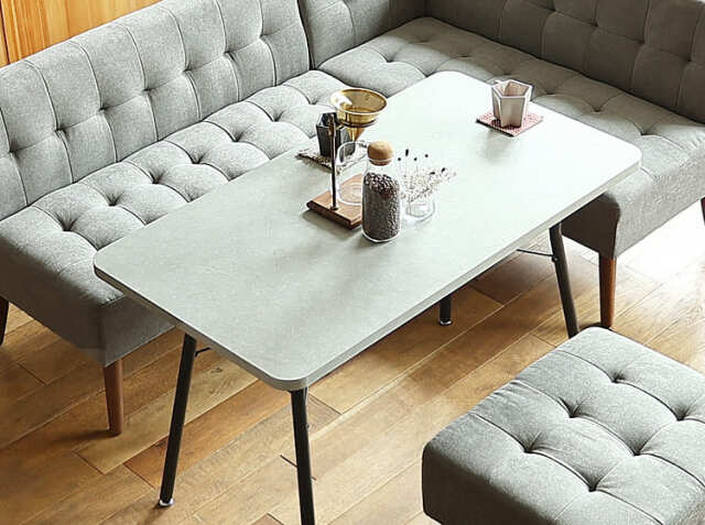 食事もできるダイニングとして、またリビングでくつろぐようにソファとしてもくつろぐこともできるソファーダイニングに合わせてご使用いただける幅110cmのダイニングテーブル、mild(ミルド)ストーングレータイプ。