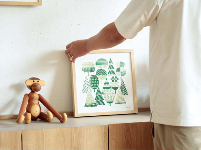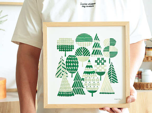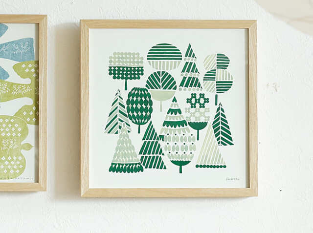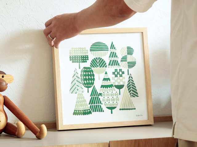 暮らしにやさしく馴染んでいくような岡理恵子 (rieko oka)デザインのアートポスター、WOODS(ウッズ)。フレームは幅32.3cm×高さ32.3cm×奥行き2.9cm。ポスターサイズは、幅30cm×高さ30cm。1枚だけで飾っても複数枚並べて飾っても、お気に入りの一枚をお部屋にプラスして、身近にアートを感じてみませんか?