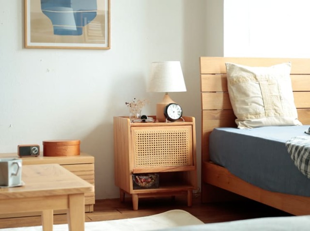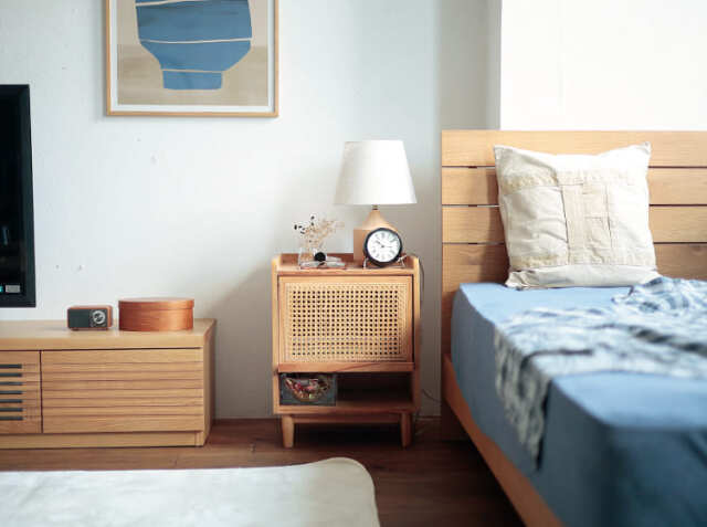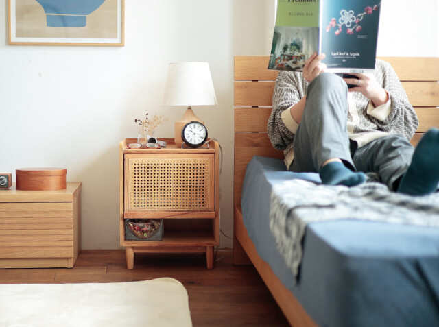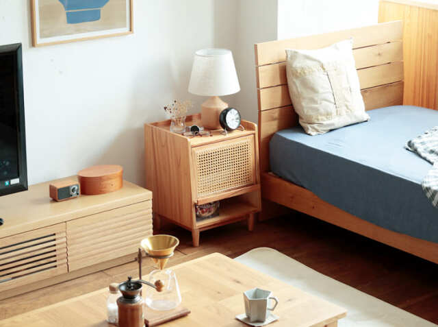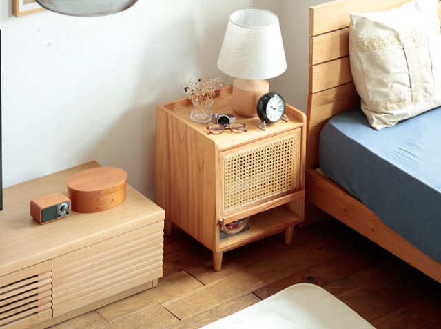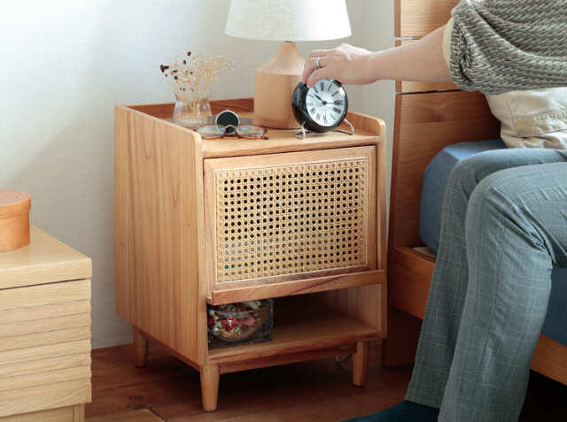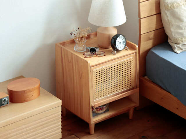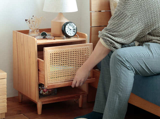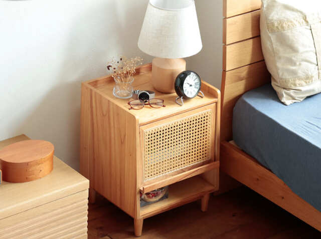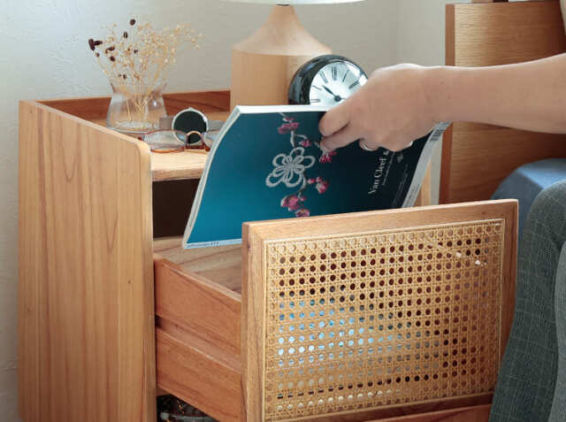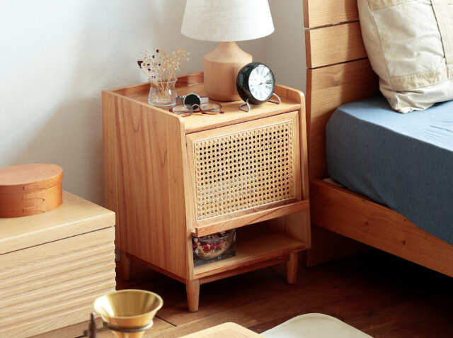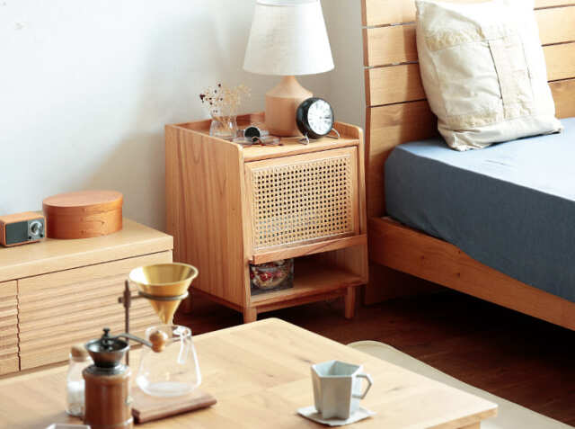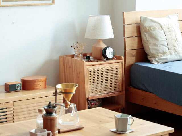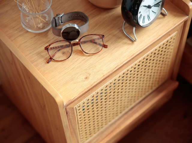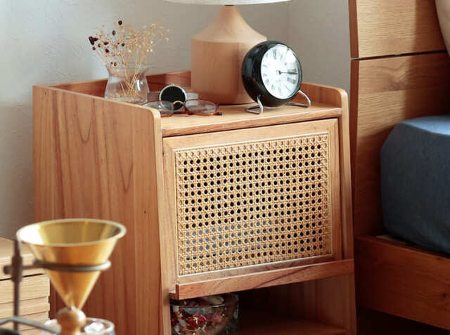 高級家具や楽器などにも使われる天然木ミンディ材とラタンを使ったアンティークテイストのナイトテーブル、Doffy(ドフィー)。眠る前に読む本を置いたり、飲み物やメガネなどを置いたり、ベッド周りで必要なものをコンパクトに置けるのがナイトテーブルを使う良いところですね。