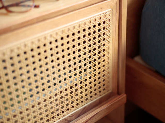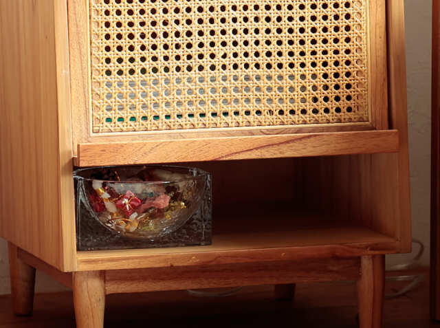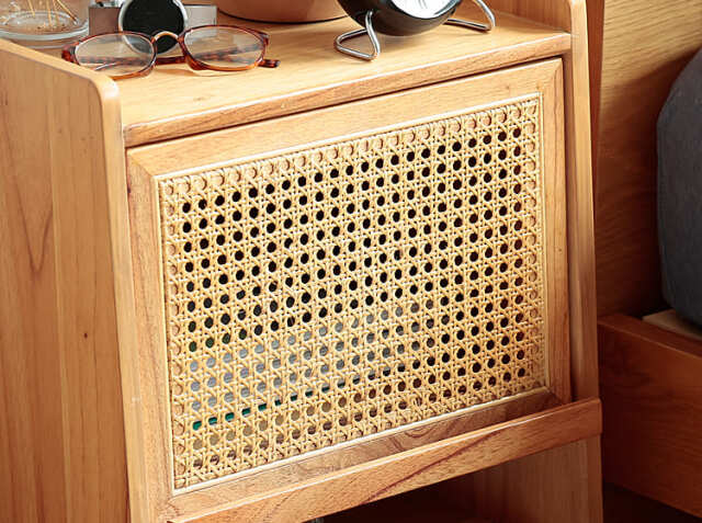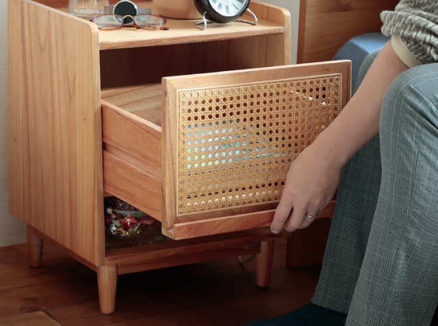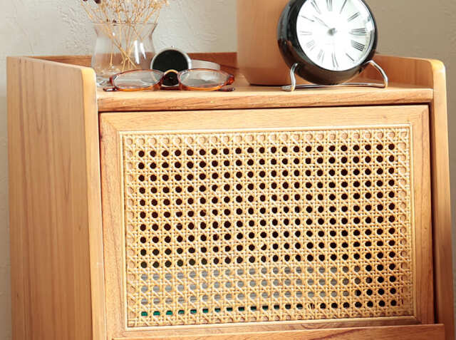 引出しに使っている素材はラタン。ラタンは通気性と耐久性を併せ持つ素材。湿度が高いときには水分を吸収し、逆に乾燥しているときには水分を放出するという特性を持っています。自然な風合いと温かみはお部屋に落ち着きを与え、心地よい空間を創出してくれますよ。