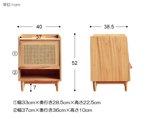 本体サイズ:幅 40cm × 奥行き 38.5cm × 高さ 52cm 引出し収納内寸:幅 33cm × 奥行き 28.5cm × 高さ 22.5cm オープン収納内寸:幅 37cm × 奥行き 36cm × 高さ 10cm 脚の高さ:7cm |