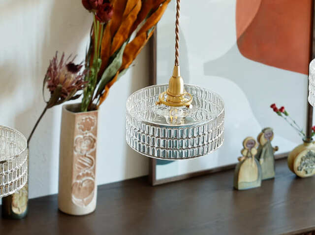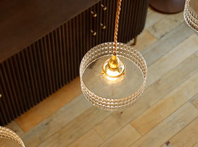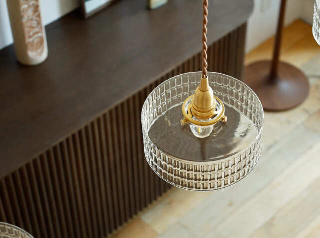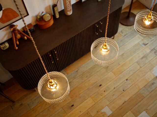 真鍮ソケットとアンティークな風合いにカッティングされたガラスシェードの組み合わせがかわいらしさを感じるガラスペンダントライト、apere(アペレ)。