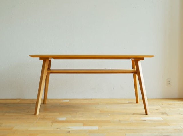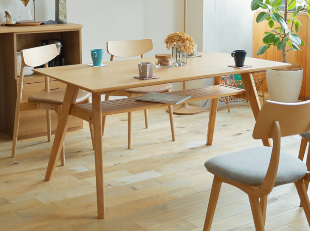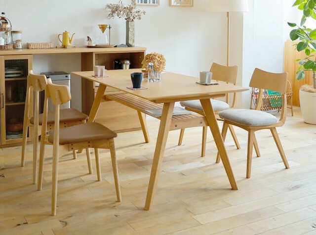 繊細な木目が特徴のアッシュ突板を使用した4人の家族でご使用いただくのにちょうどいい棚板付き幅150cmのダイニングテーブル、Adish(アディッシュ)ナチュラルタイプ。