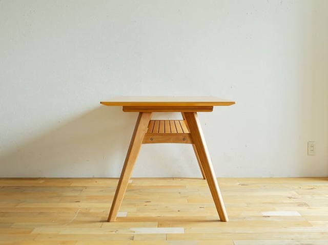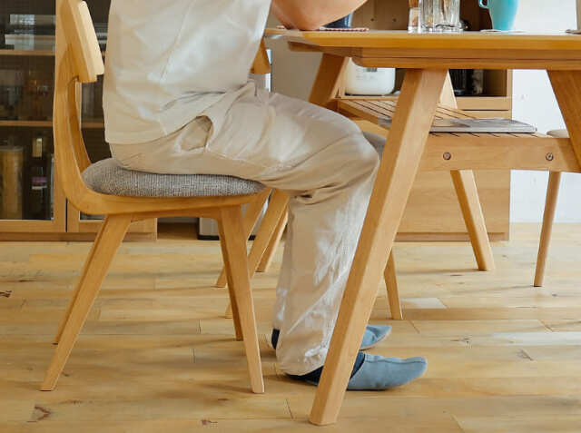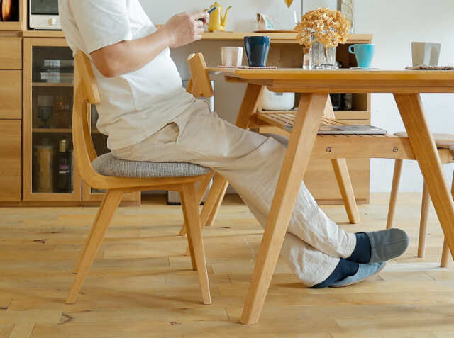 幕板があるテーブルだとチェアーが奥まで収納できないというケースもありますが、こちらのテーブルは、幕板をつけない設計にすることと、脚部をハの字に設計することでチェアをテーブル下に収納することができます。