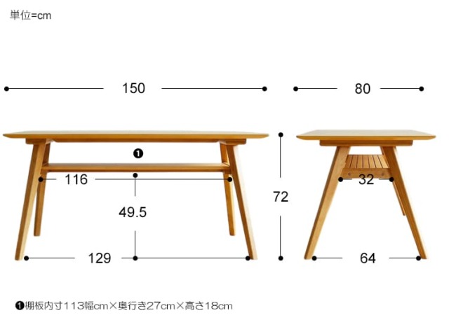 幅 150cm × 奥行き 80cm × 高さ 72cm 棚板内寸:幅 113cm × 奥行き 27cm × 高さ 18cm |