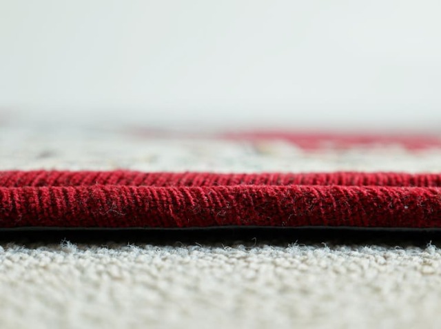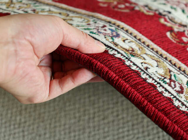 鮮やかな模様を細部まで手触りの良いシェニール糸で織りあげた高級感のあるフロアーマット、Damini(ダミニ)レッド 60×90cm。