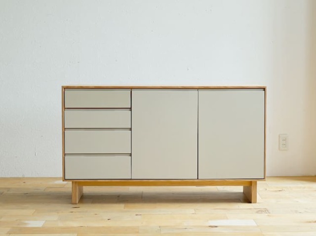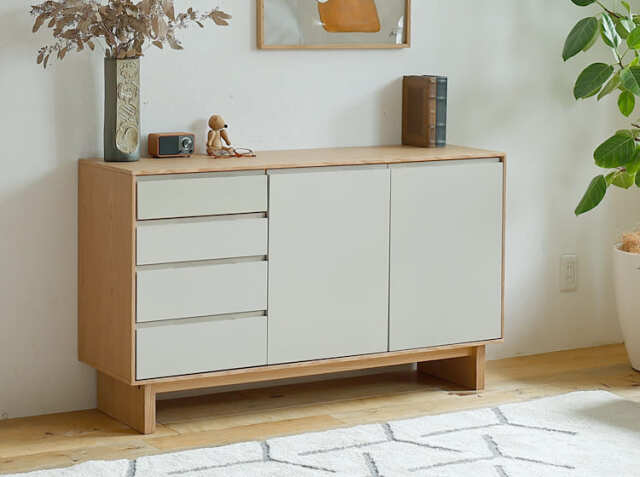 天然木ポプラ材を全面に使用し、引出しや扉などの前板は同じポプラをグレージュカラーに塗装を施すことで、温かみを感じる北欧デザインに仕上げた幅120cmのサイドボード、Parm(パーム)。