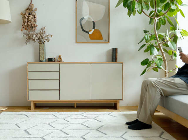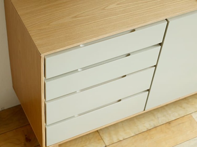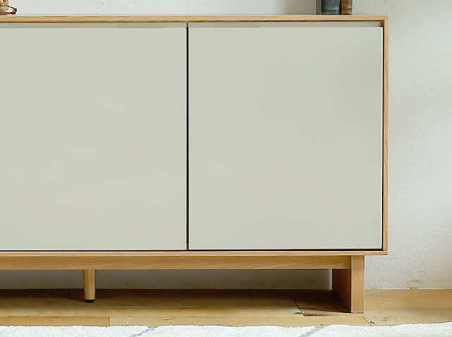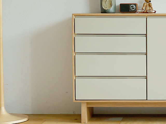 天然木ポプラ材を全面に使用し、引出しや扉などの前板は同じポプラをグレージュカラーに塗装を施すことで、温かみを感じる北欧デザインに仕上げた幅140cmのサイドボード、Parm(パーム)。