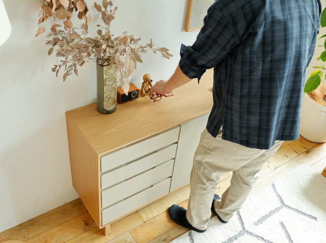 家にいる時間の大半を過ごすリビング。だからこそ、便利に使えておシャレに見えるサイドボードは必須アイテムです。ちょっとだけでも空いた場所に置いて、お部屋の中に収納と優雅さをプラスしてみませんか?女性の方でもストレスなくご使用いただける高さは70cm。奥行きも圧迫感を感じさせない35cm。すっきりとシンプルなデザインは、置く場所を選ばず、お家の幅広いシーンで活躍してくれますよ。