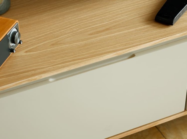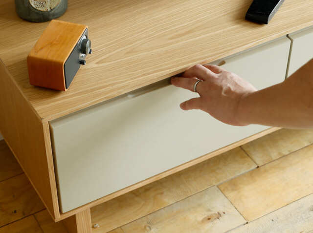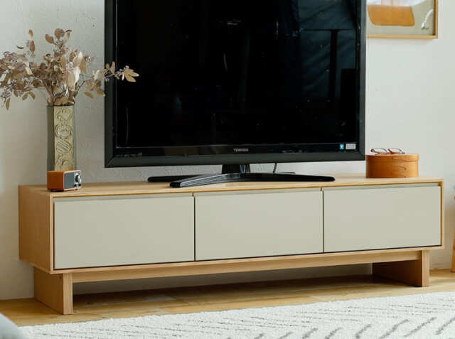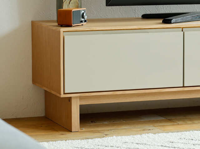 天然木ポプラ材を全面に使用し、引出しの前板は同じポプラをグレージュカラーに塗装を施すことで、温かみを感じる北欧デザインに仕上げた幅150cmのテレビボード、Parm(パーム)。