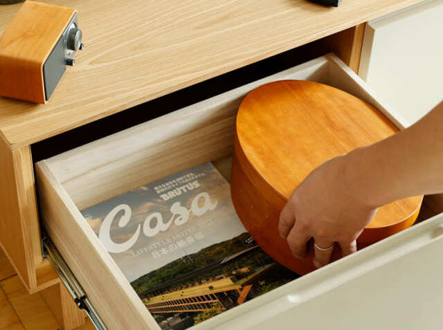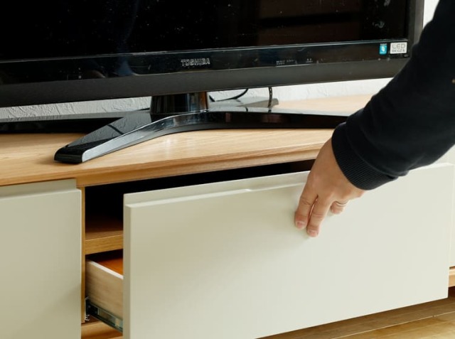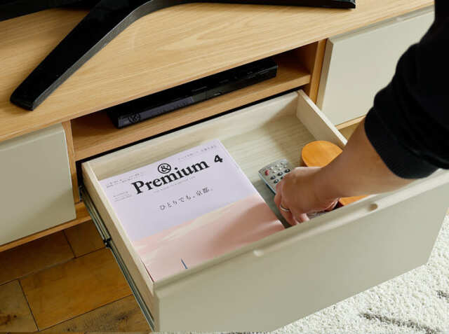 生活の中で増えていく物。そんな物の中には、生活感が出ないよう隠して収納したいという方も多いのではないでしょうか。こちらのテレビボードは左右共通のサイズの2杯の引出しにたっぷり収納することができますよ。