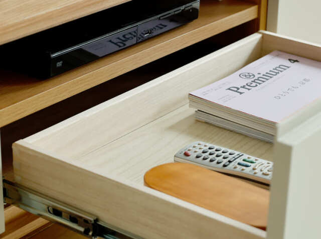 中央の引出しを開けると、AVデッキなどを収納するスペースとリモコンなどを収納するのに便利な高さを抑えた引出し収納の2つの収納となります。